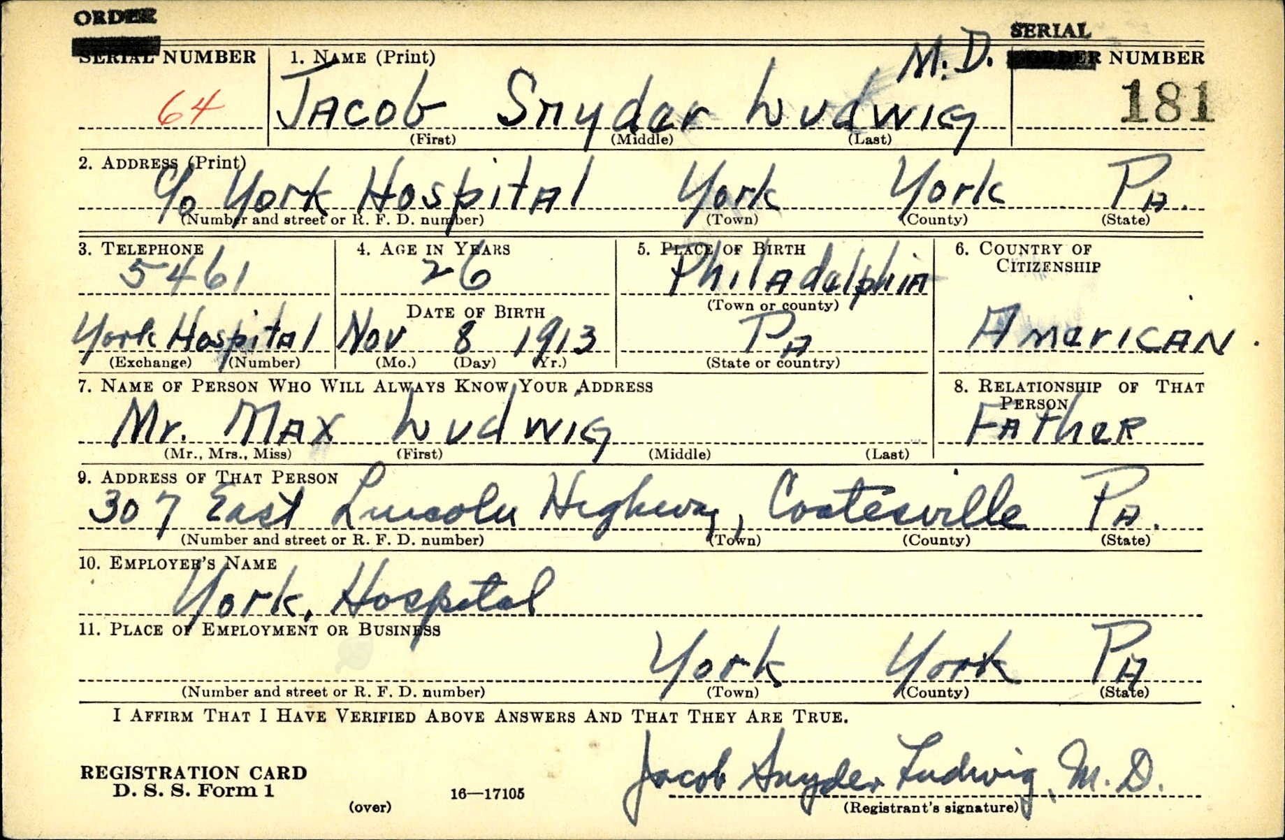 Wearing his dramaturg cap, Matt had worked with his colleague Mollie Heil—stage manager at Alabama Shakespeare Festival—to uncover records about my family I’d never seen before. Among them, they found my dad’s birth certificate, where I confirmed for the first time that both of his parents were born in Russia and learned, whether by error or assimilation, that he was registered at birth with the last name “Ludwik”. And perhaps most curious and precious to me, they found my dad’s draft card.